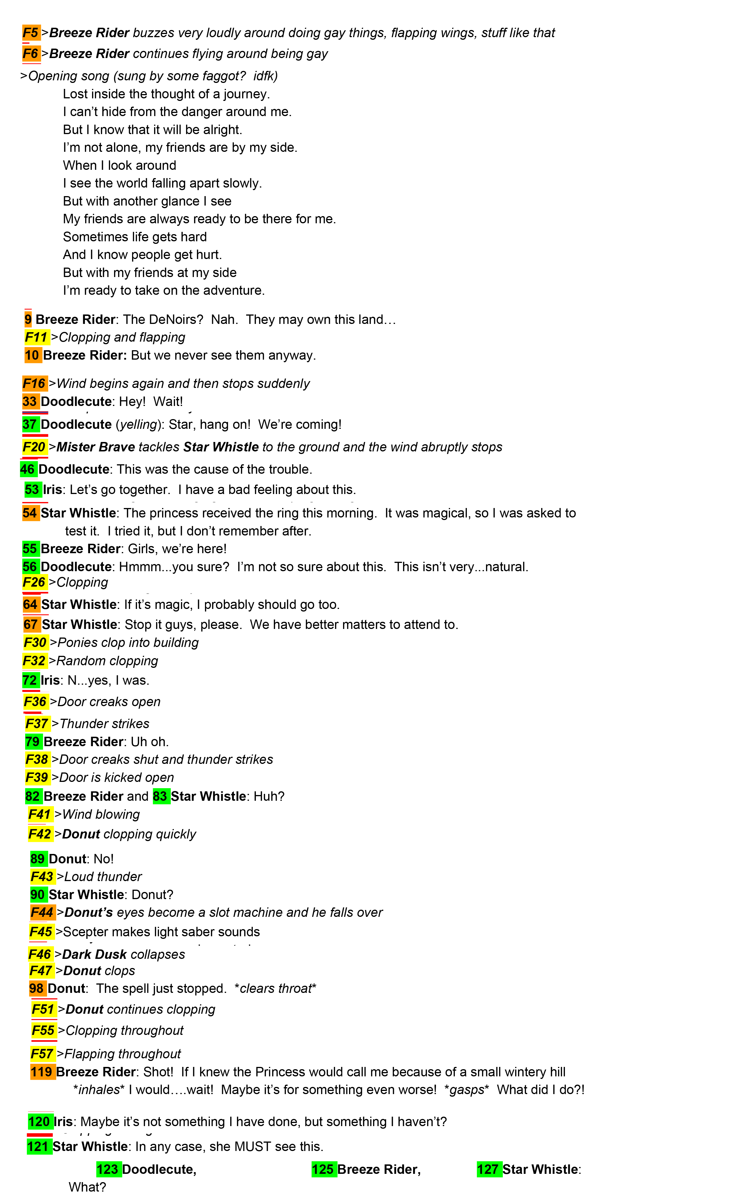 well as this thread nears the bump limit, i thought i'd share with y'all how the first 2 minutes are shaping up. this includes the awesome opening song we got, the foley line submitted 30 minutes ago, and everything except one outstanding foley line (F6). |