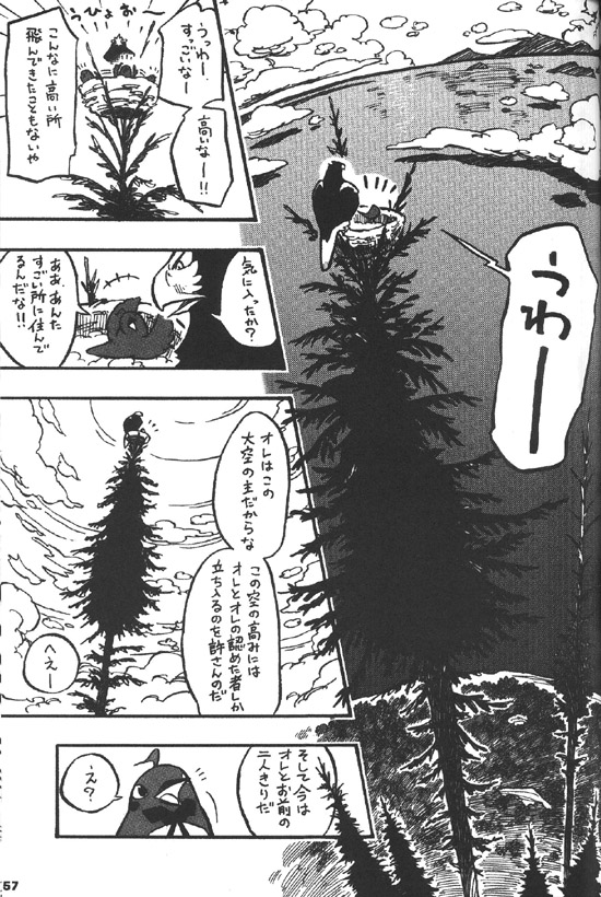 큰유리새: 우와-- 굉장하구나-- 높구나--!! 이런 높은 곳 날아서 온 적도 없어. (우효오---)