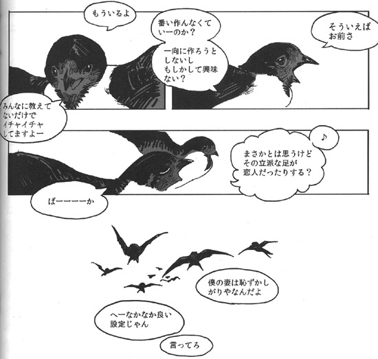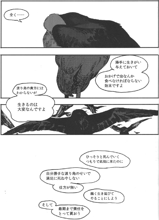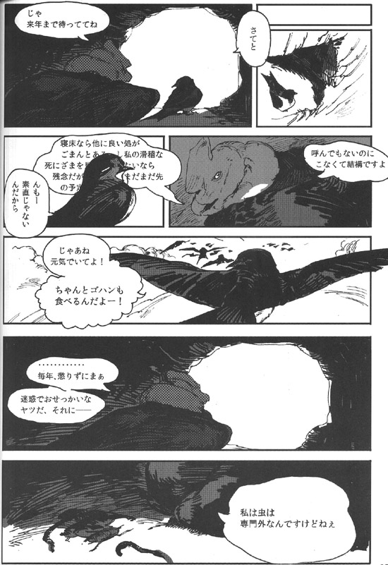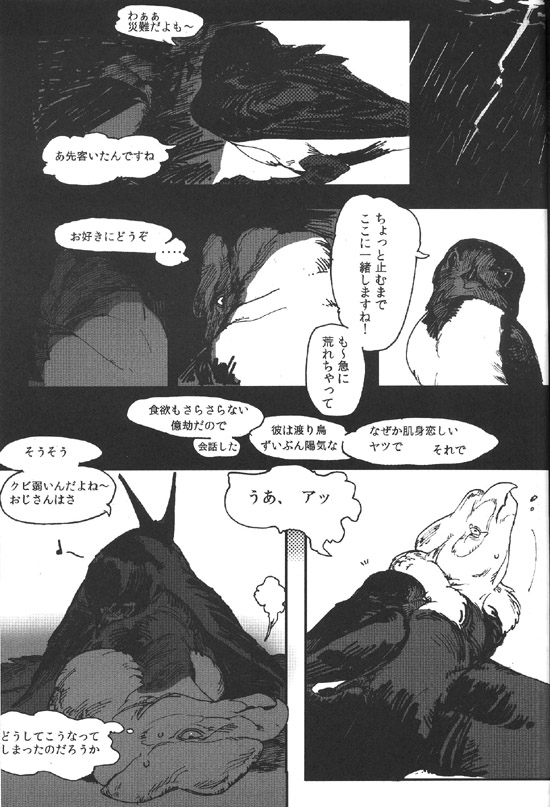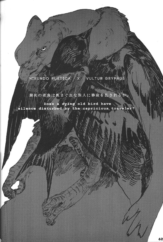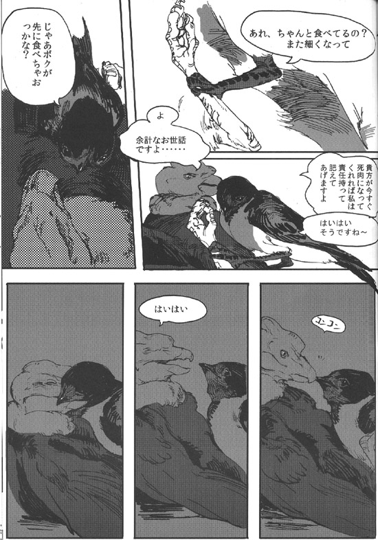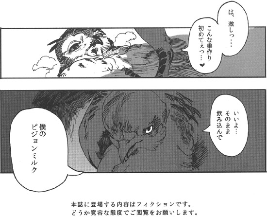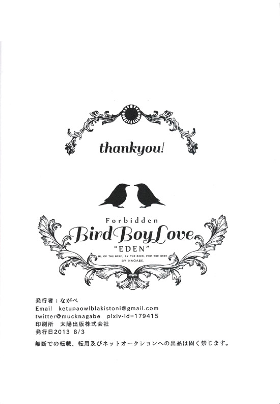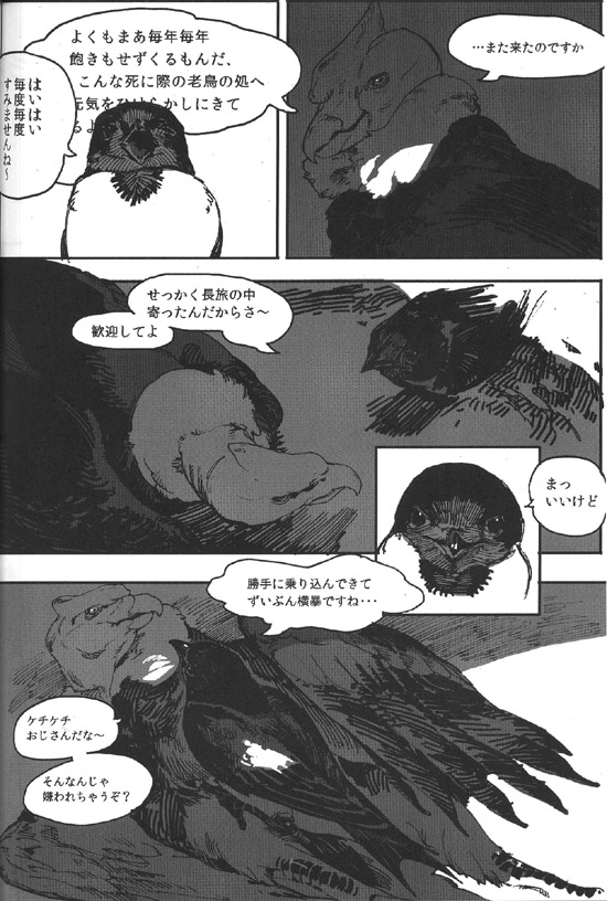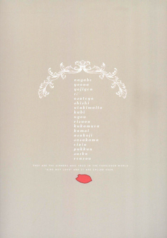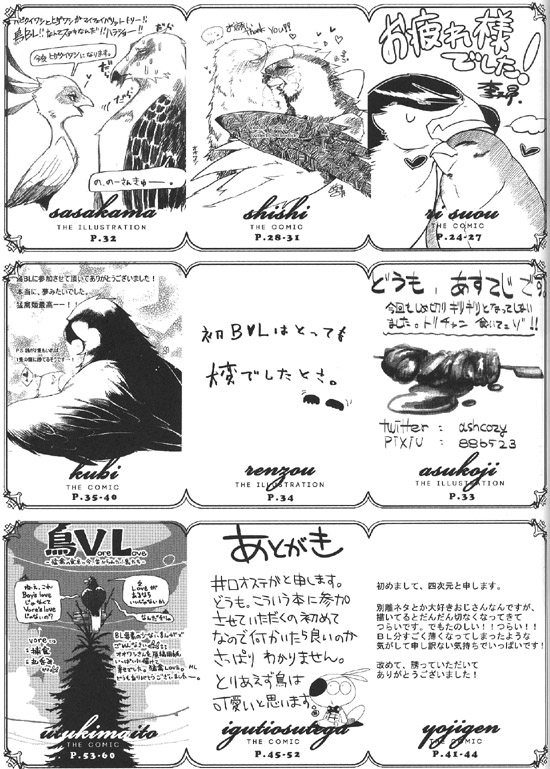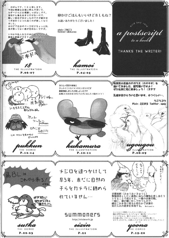 안녕하세요, 18이라고 합니다. 이번엔 멋진 기획에 불러 주셔서, 나카베씨에게는 쭉 감사입니다. 평상시에 새를 별로 그리지 않으므로, 어려운 부분이 많았습니다만 마감이 가까워짐과 함께 그리는 게 즐거워졌습니다. 덕분에 저 자신의 페이지만 조금 BL 냄새가 감돌지 않는 느낌을 부인할 수 없습니다만.