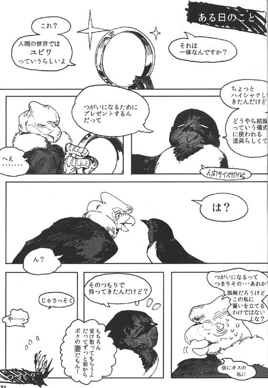 콘돌: 짝이 된다는 건 요컨대 그... 그건가? 오해이겠지만 이 나에게 맹세한다는 건 아니겠지? (가령 수컷인 내게.)