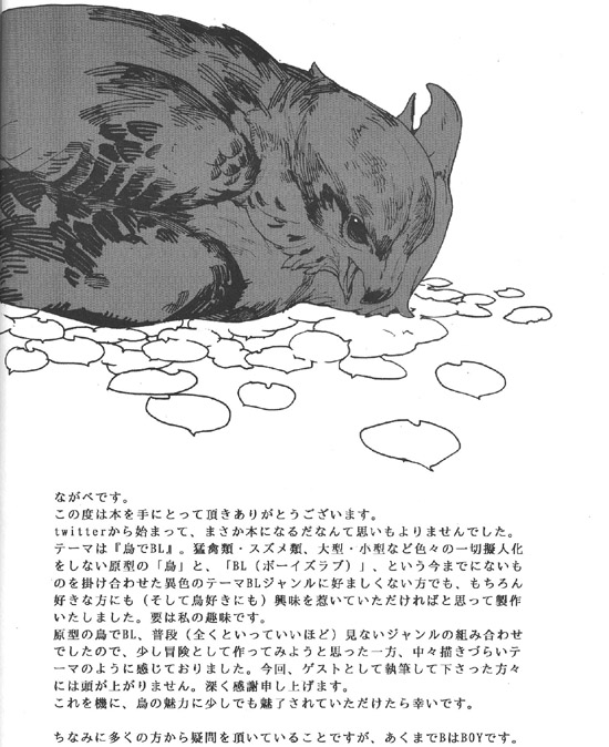 테마는 『새로 BL』. 맹금류 · 참새류 · 대형 · 소형 등 여러 가지 일절 의인화를 하지 않은 원형의 「새」와, 「BL(보이즈 러브)」, 라는 지금까지 없는 것을 결합한 이색적인 테마 BL 장르에 호감이 가지 않는 분이라도, 물론 좋아하는 분이라도(그리고 애조가에게도) 흥미를 끌 수 있다면 좋겠다고 생각해서 제작했습니다. 요는 제 취미입니다.