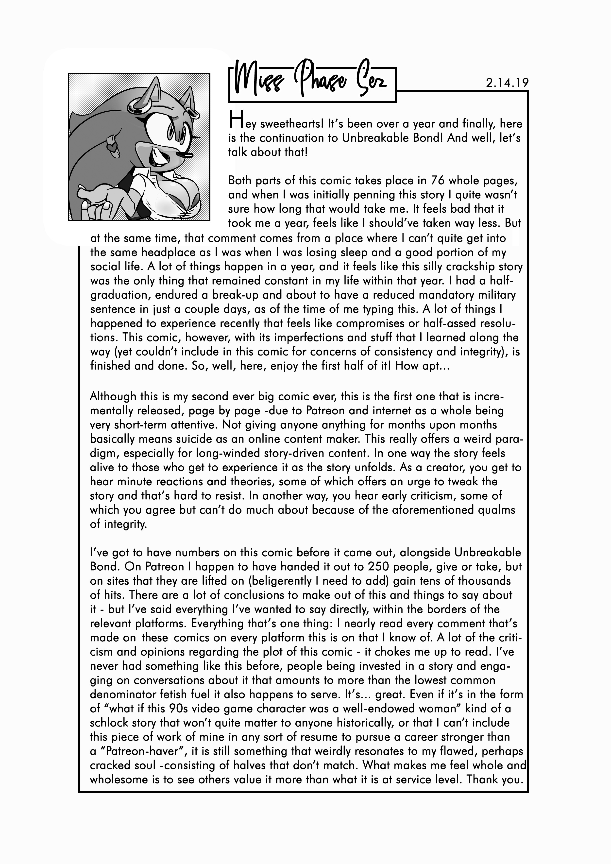 This copy of Unbreakable Bond has slightly edited text for dialogues to fix grammar and enunciation issues that a lot of you kindly pointed out to me. I'm sorry that I was unable to fix much of the art in the short span of time. I know a lot of you really really enjoyed it, but I know it's far from perfect and hopefully I'll get much better at it for my next ones!