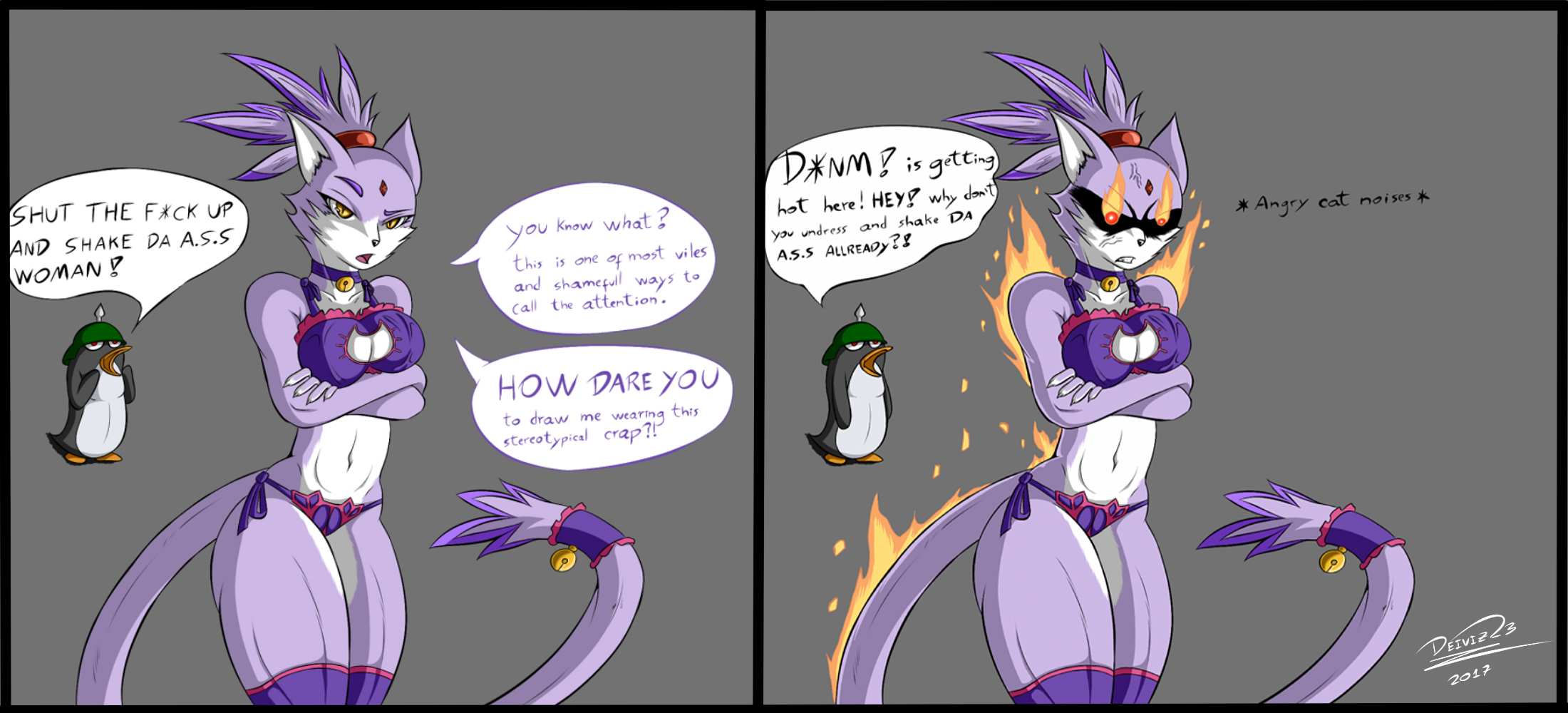 Althought, she is able to exchange her bionic parts for a more "real" ones, she could easilly look like a normal feline... a 7 feet tall normal feline, which it doesnt help much to disguise her in a crowed place, one of the reasons of why she hates public places and preffer to stay hidden.