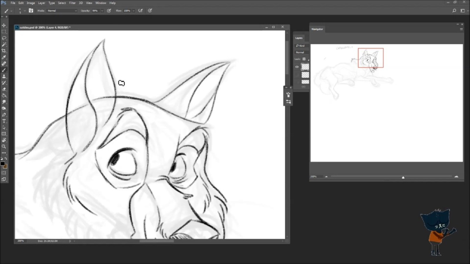 You can see at first my main concern was getting the basic body parts where I wanted them. I didn't actually have a specific idea in mind for this guy. A basic grasp of an animal's skeletal structure will help you more easily interpret the pose of the animal, because a lot of the time it's hard to see parts of the body underneath all the fur.