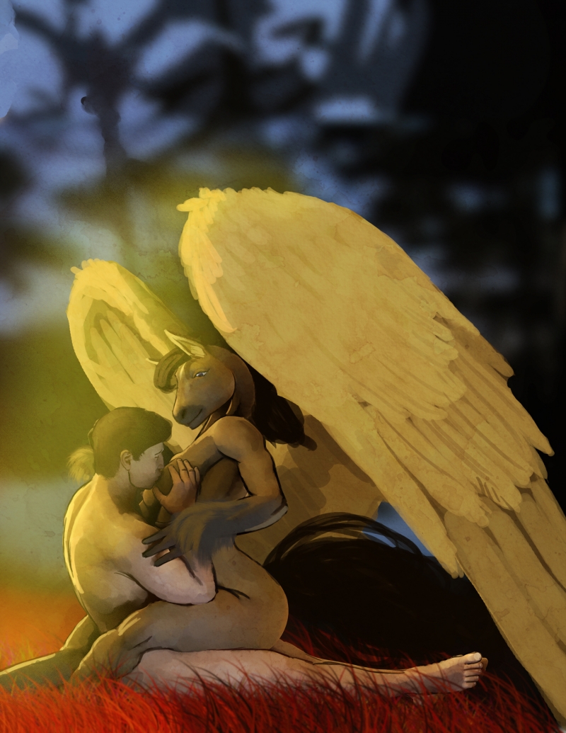 with this particular (and the previous one) i only used 3 distant lights in DAZ and no Uber environment (had i not used wings) this cuts down render time and gives a more saturated color scheme. and you have more visible control over the lights (again don't render anything with SO MUCH opacity maps )