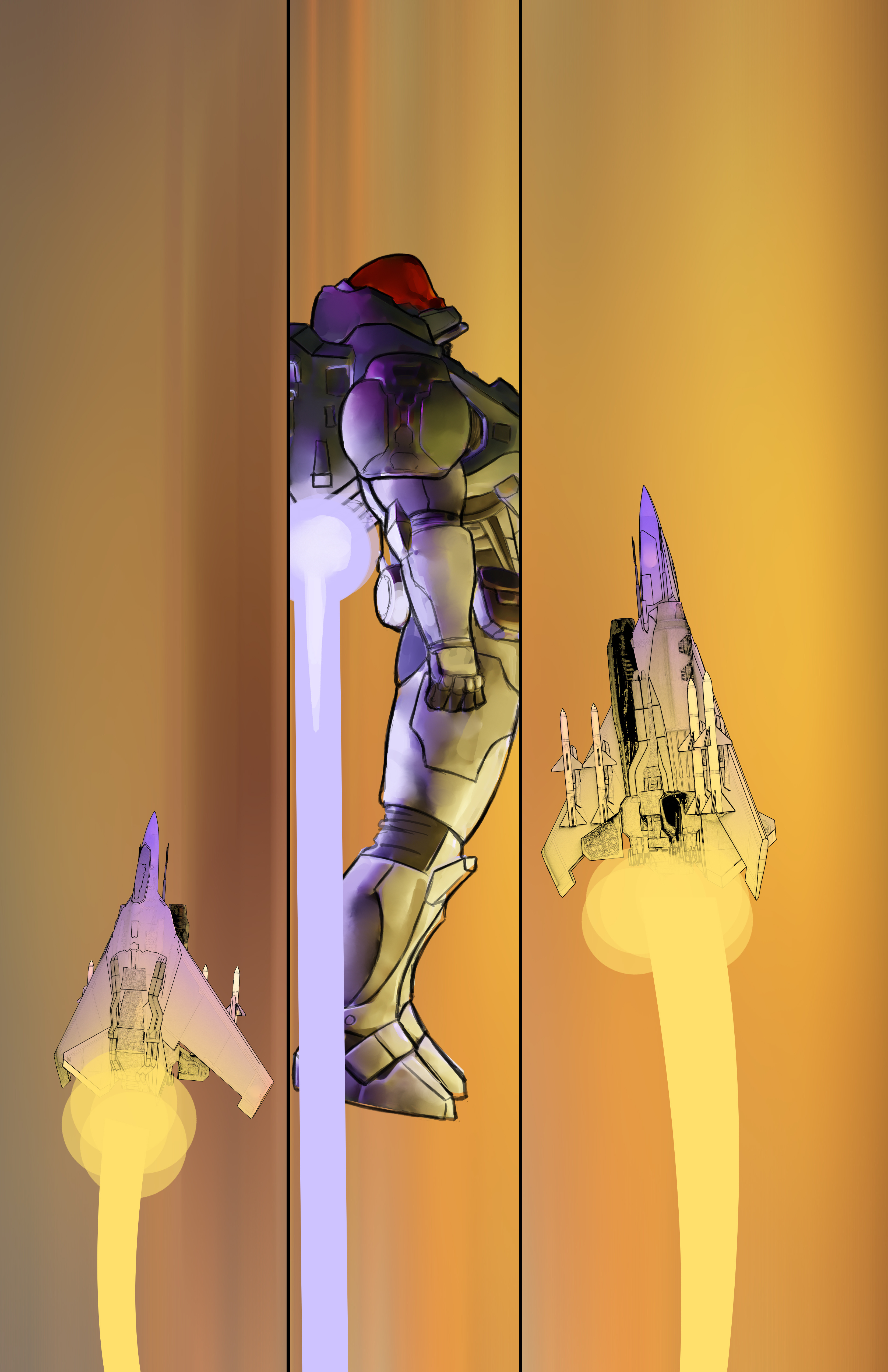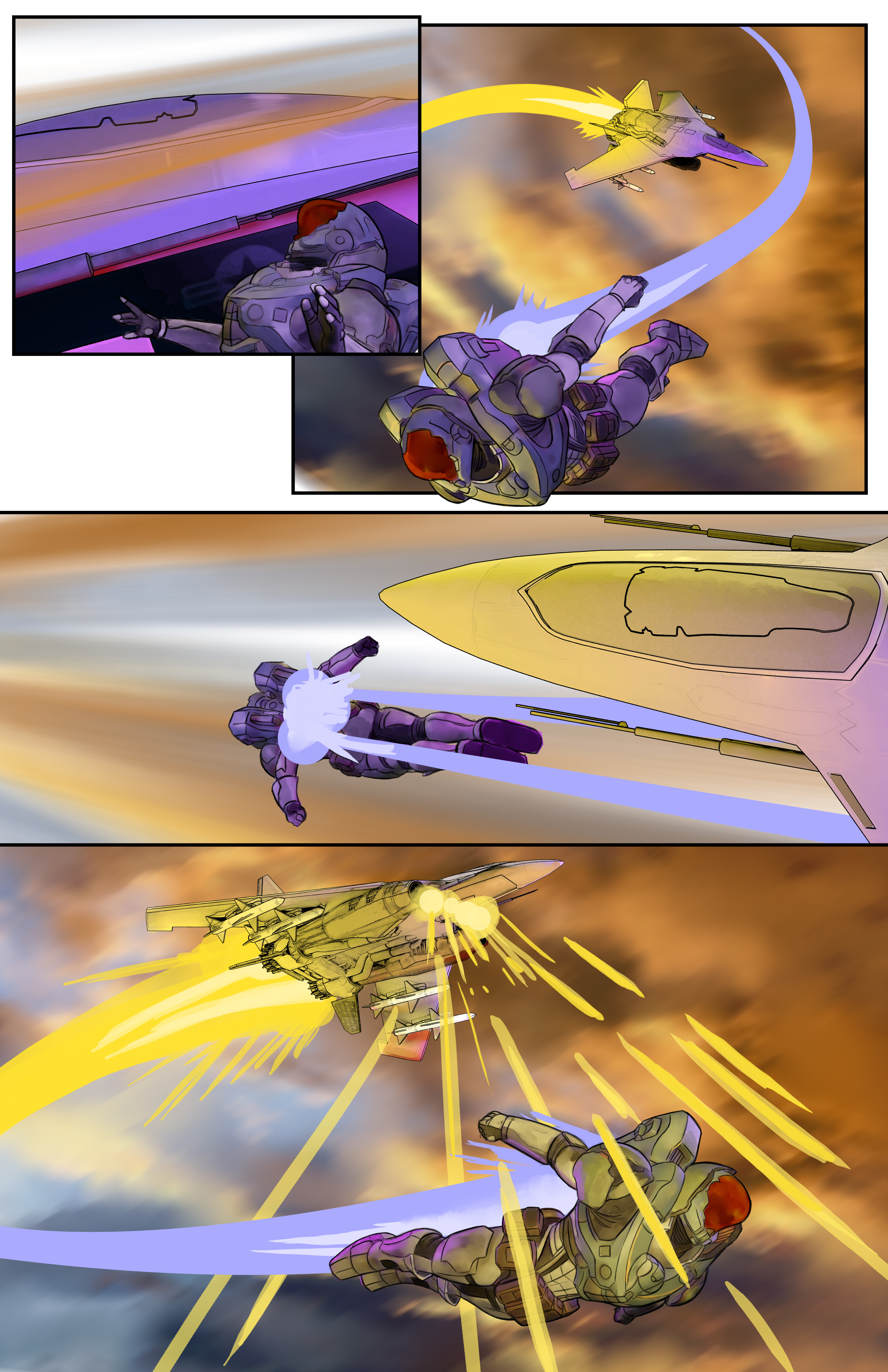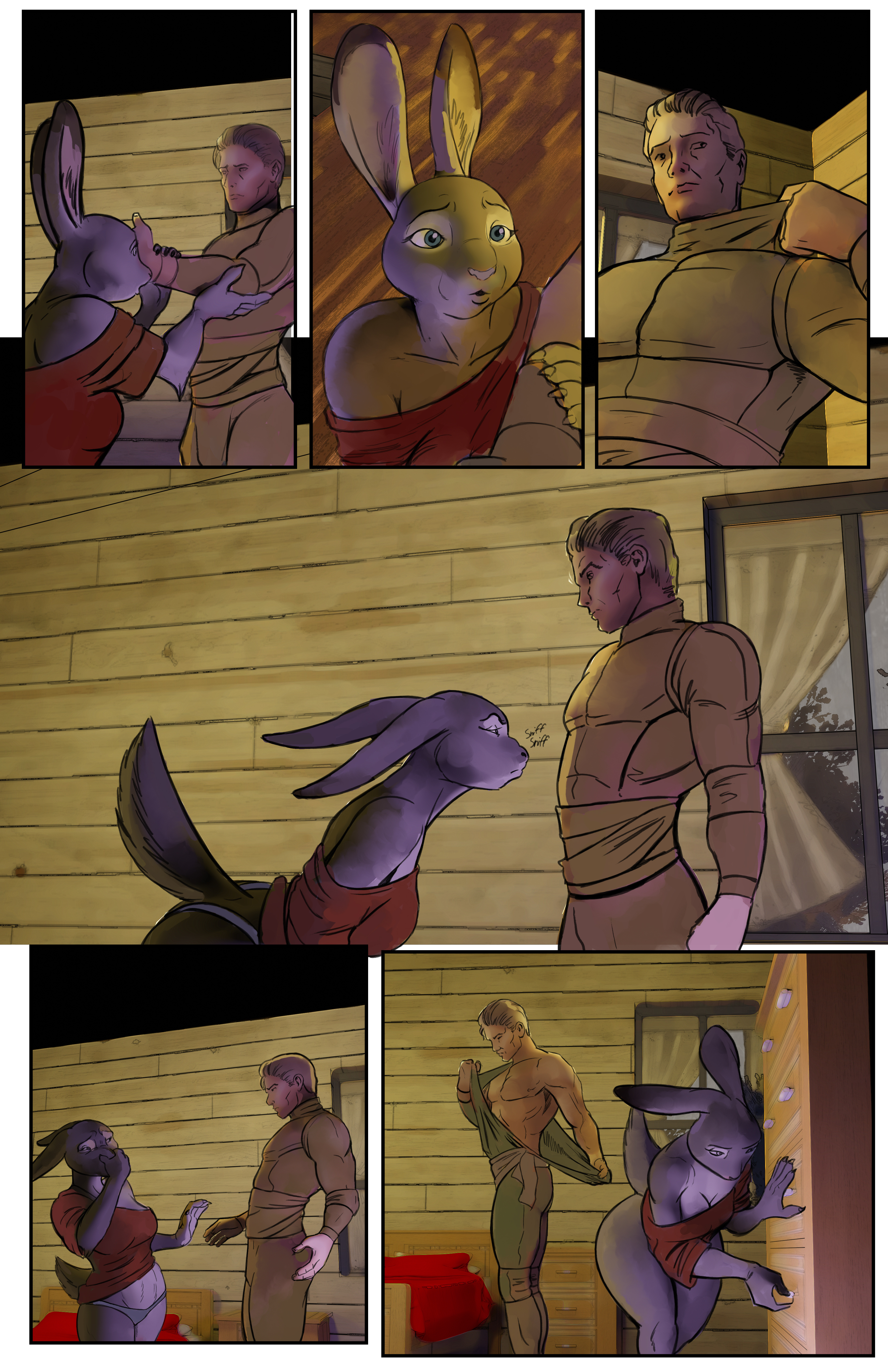 the first image was my first attempt. i am trying to be loose and rough so i don't stress myself out on filling in the color just right, the next i tried refining the pallet of the two characters, third was focusing on just the lighting and the final i was trying to get the guy's skin color down as i felt the first was too grey and the second too "florescent"