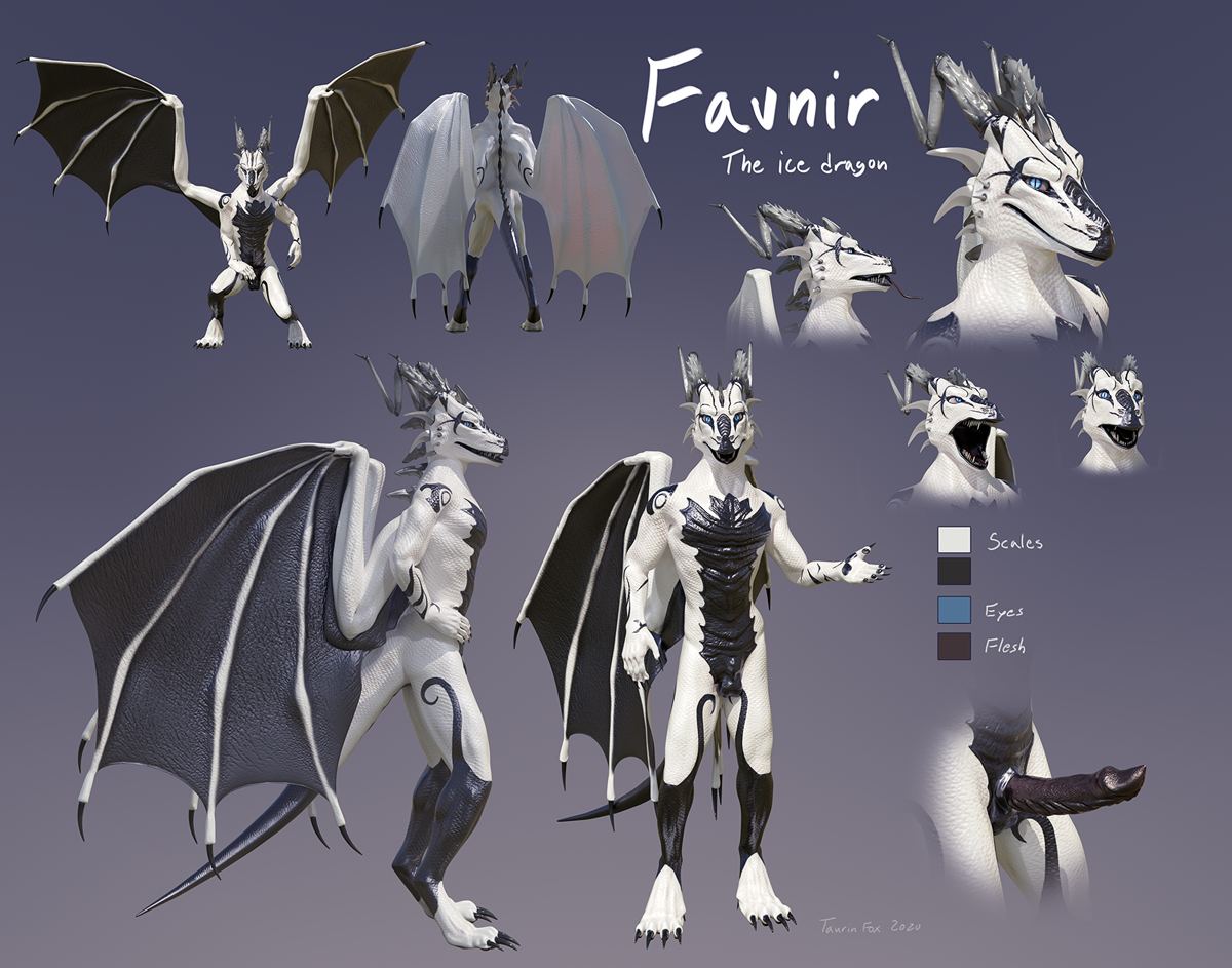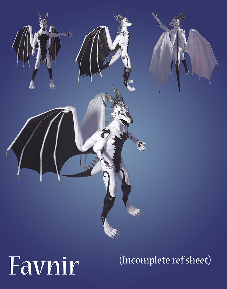 This is Favnir's 3D rendered ref sheet, which he got as part of his animation commission ("Money Shot"). I had actually forgotten how good his character looked, especially with the scale texture ^.^