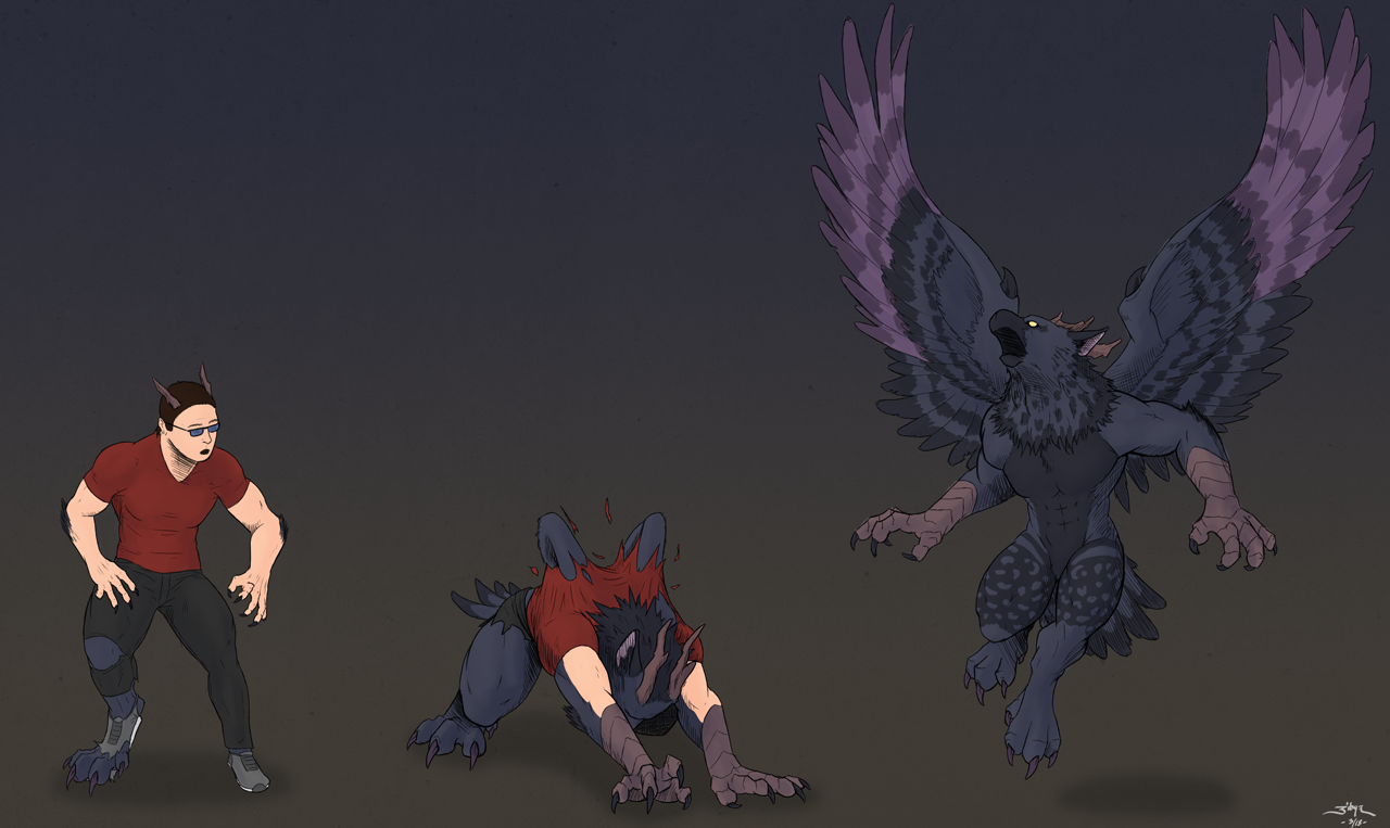 Man changing into his fem werecerberus form.