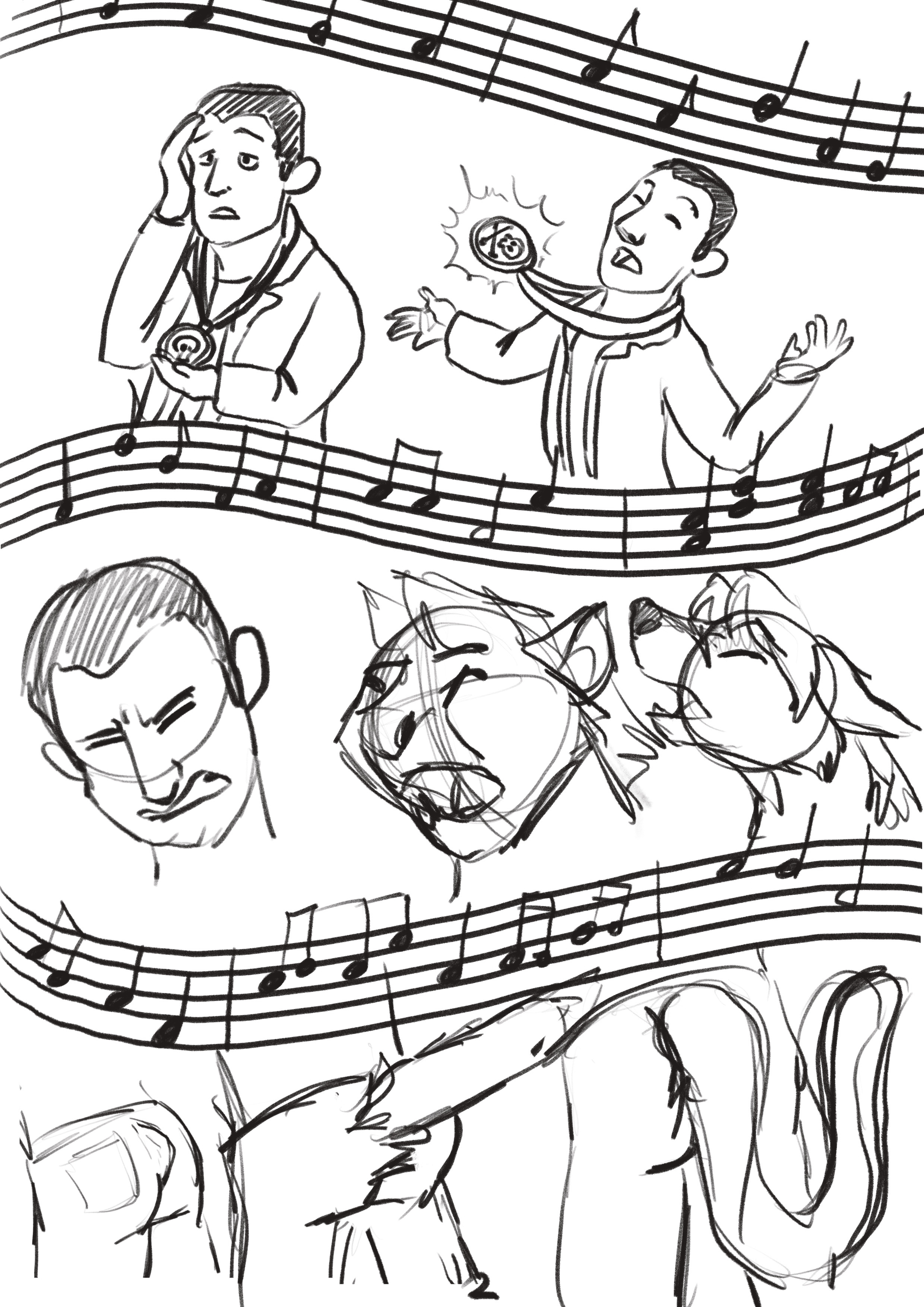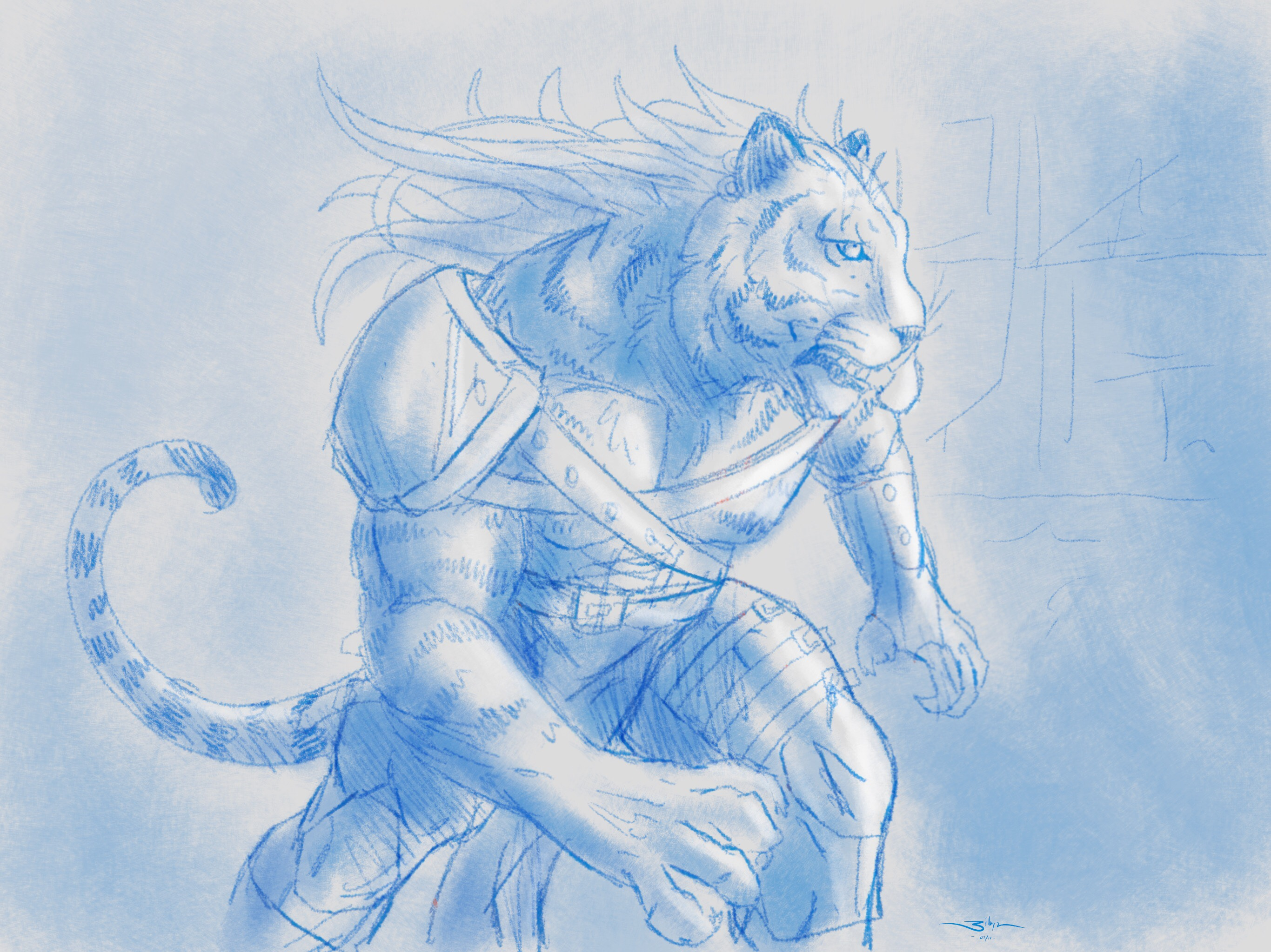 Rough sketch, man changes into his weresona, a white tiger.