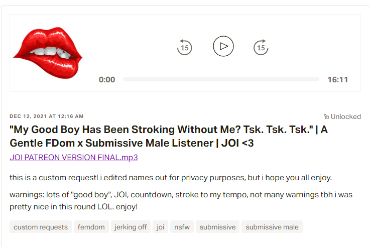 | - | My Good Boy Has Been Stroking Without Me Tsk. Tsk. Tsk.[Gentle FemDom][Submissive Male Listener][JOI][mistress].m4a | 15776489 | 2022-12-09 18:12:45 |
