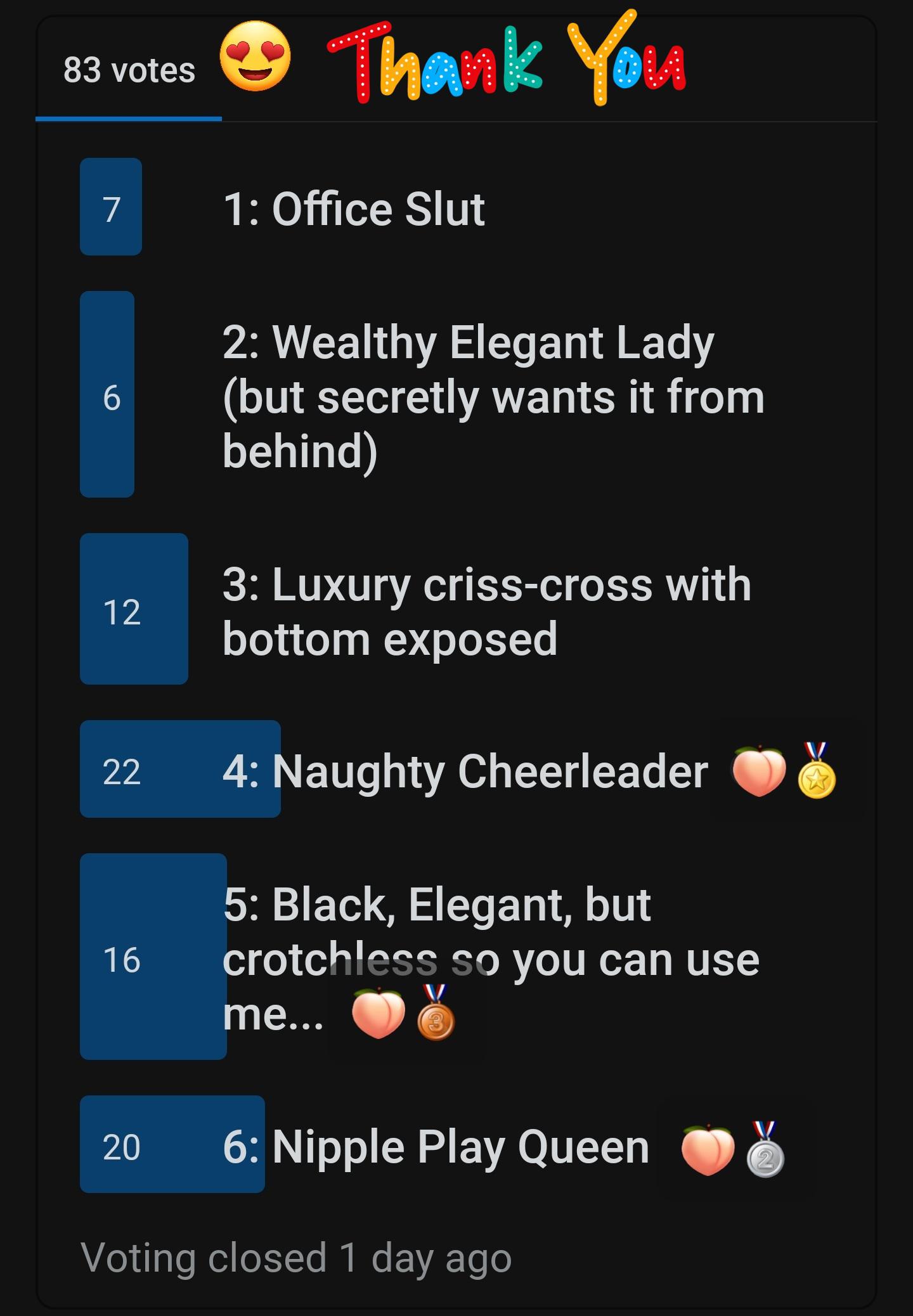 | - | MissPeachAdventures - 2023-02-02 - This is the winning outfit! Naughty Secretary. Very good selection, and thanks for voting. Miss Pea.jpg | 423239 | 2023-05-04 16:54:28 |