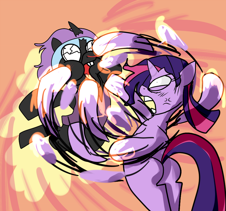 Nexus then turned his attention to a dagger resting beside the bowl, picking it up with his magic. The blade was fine, sharp, and clean. It had never been used, although Nexus intended to change that. He turned back towards Twilight, who was still twisting, flailing, and shouting out muffled protests. He drew close, and, after lowering Twilight a little closer to the ground, Nexus proceeded to give the mare a swift kick in the stomach.